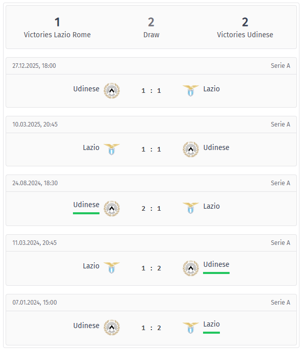 Ultima serie a fost mai strânsă decât ar fi dorit Lazio Roma. Ultima întâlnire din decembrie 2025 s-a încheiat cu 1-1, iar în 2025 a mai fost un 1-1. Udinese Calcio a câștigat ambele meciuri de campionat din 2024, în timp ce singura victorie a Lazio Roma din acest eșantion de cinci meciuri datează din ianuarie 2024. De remarcat: în toate cele cinci întâlniri, ambele echipe au marcat, toate au adus peste 1,5 goluri și niciuna nu a depășit 3,5 goluri.