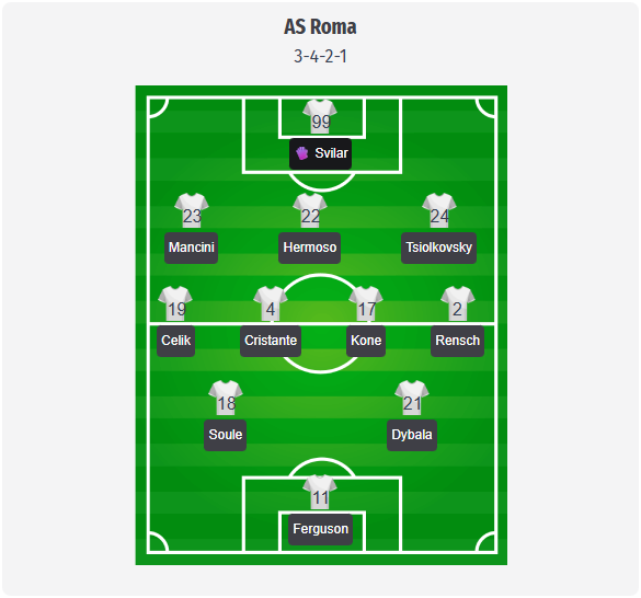 La AS Roma se așteaptă un 3 4 2 1 familiar sub Gasperini, cu Svilar în poartă în spatele unei linii de trei formate din Mancini, Hermoso și Ziolkowski. Çelik și Rensch ar trebui să ocupe aripile, în timp ce Cristante și Koné vor forma mijlocul central. Această structură menține echipa compactă în prima fază și pregătește atacurile pe aripi. Mai în față, Soulé și Dybala vor juca probabil între linii, în spatele lui Ferguson, ceea ce va conferi AS Roma fluiditate și pericol în fața porții din spațiile libere. Marile semne de întrebare se referă la absențele lui Ndicka, El Aynaoui, Bove, Baldanzi și, în special, Pellegrini, astfel încât adâncimea lotului de mijlocași creativi ar putea fi limitată, iar schimbările ar putea fi mai degrabă conservatoare. Rămâne o prognoză a echipei de start și nu o formație confirmată.