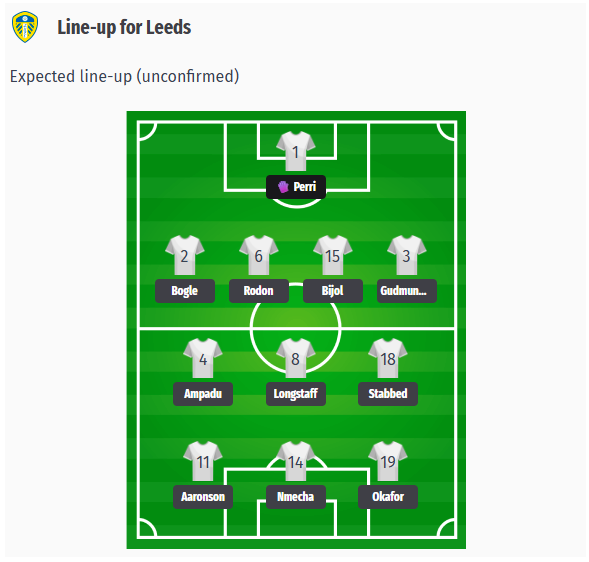 Leeds ar trebui să înceapă pe teren propriu, Elland Road, într-un sistem 4-3-3. În apărarea centrală sunt așteptați Bijol și Rodon, iar în fața lor se va forma probabil un trio de mijlocași format din Ampadu, Longstaff și Stach. În ofensivă, Daniel Farke va miza probabil pe un triunghi mobil format din Aaronson, Nmecha și Okafor, care va trebui să pătrundă în adâncime și să se strecoare între linii. Bornauw și Gnonto sunt ușor accidentați, dar vor fi disponibili pe bancă.