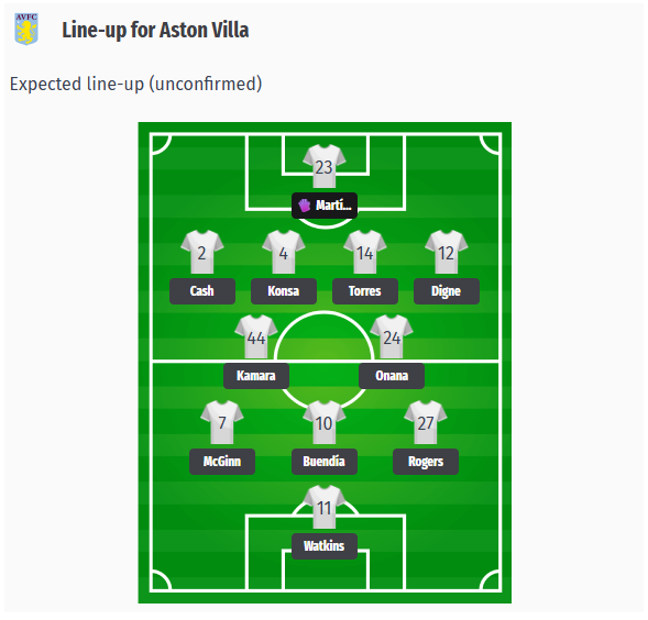 În mijlocul terenului, opțiunile sunt ușor limitate. Barkley nu este eligibil pentru Cupa Europei, deoarece nu a fost înscris în Europa League, ceea ce îi afectează rolul în gestionarea sarcinii totale. Tielemans se întoarce treptat după accidentare și a avut până acum un timp de joc limitat la echipa națională a Belgiei. Prin urmare, se așteaptă ca Kamara și Onana să înceapă în centru, în timp ce în linia ofensivă de trei din spatele atacantului Watkins vor juca probabil Rogers, Buendía și McGinn.