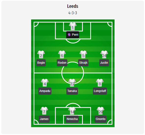 Antrenorul Daniel Farke nu va avea probabil surprize mari și va miza din nou pe sistemul 4-3-3, care și-a dovedit eficiența. Perri va începe în poartă. Linia de patru din apărare va fi formată din Bogle, Rodon, Struijk și Justin. La mijlocul terenului sunt prevăzuți trei jucători, Ampadu, Tanaka și Longstaff, în timp ce Stach este indisponibil din cauza unei accidentări. În atac, James, Nmecha și Gnonto sunt prevăzuți ca primii trei. Notă: această formație este o prognoză până la anunțarea oficială a echipei de start.