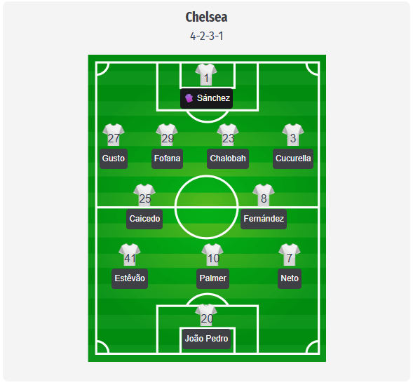 Se așteaptă ca Chelsea să înceapă cu sistemul obișnuit 4-2-3-1, antrenorul Enzo Maresca trebuind să improvizeze mai ales în centrul apărării. În apărarea centrală, având în vedere absența pe termen lung a lui Levi Colwill, care are o ruptură de ligament, Wesley Fofana și Trevoh Chalobah ar trebui să înceapă. La mijlocul terenului, Roméo Lavia este în continuare indisponibil din cauza unei leziuni musculare, astfel încât mijlocul terenului este puțin subțire din punct de vedere al efectivului. În poartă ar trebui să fie Robert Sánchez, care și-a redus semnificativ rata de erori în ultima perioadă și conduce liga cu șapte meciuri fără gol primit. În atac, Cole Palmer ar putea reveni în primul unsprezece după o pauză de două luni, iar Estêvão va continua să fie utilizat cu precauție. Va fi interesant de văzut dacă Maresca va face din nou ajustări în lot, după rotația intensă din ultimele săptămâni.