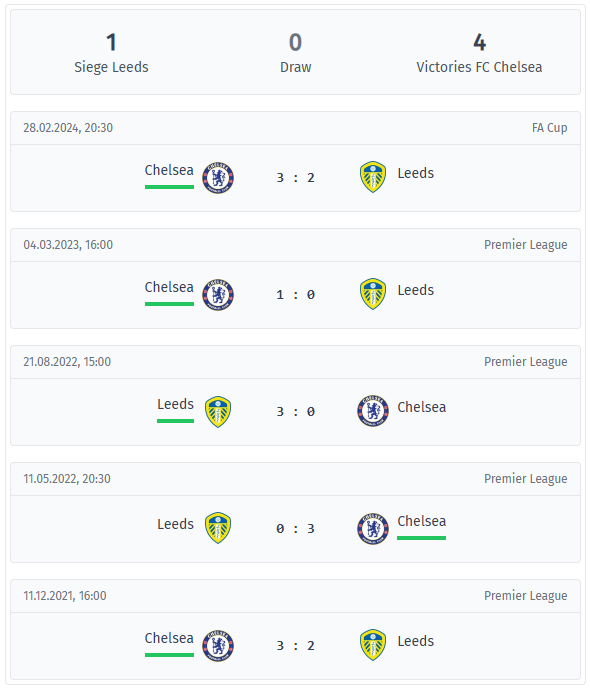 Cele mai recente cinci confruntări directe au fost câștigate clar de Chelsea și Leeds, Chelsea câștigând de patru ori, Leeds doar o dată, fără a exista niciun egal. Ultima întâlnire, din februarie 2024, a avut loc în FA Cup și s-a încheiat cu un scor de 3-2 pentru Chelsea, după un meci cu multe goluri. Singura victorie a lui Leeds în această serie a fost clară, în august 2022, când a învins Chelsea acasă cu 3-0. Patru dintre ultimele cinci meciuri au adus cel puțin trei goluri, Chelsea a marcat în patru dintre aceste meciuri, iar Leeds a primit cel puțin un gol în tot atâtea întâlniri. Concluzia: ultima pereche a adus în mod regulat multe goluri, iar un scor defensiv de 0-0 pare aproape imposibil în această serie.