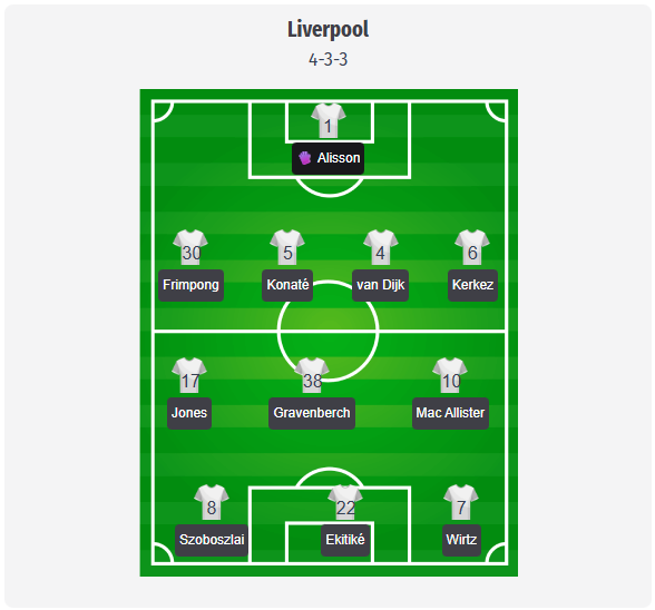 Liverpool va rămâne probabil la familiarul 4-3-3, iar echipa de start prevăzută corespunde ultimelor rapoarte: Alisson; Frimpong, Konaté, van Dijk, Kerkez; Jones, Gravenberch, Mac Allister; Szoboszlai, Ekitike, Wirtz. Mac Allister va fi pivotul mijlocului de teren, Jones și Gravenberch vor juca mai ofensiv, în timp ce Szoboszlai și Wirtz vor juca în jurul lui Ekitike. Konaté și van Dijk sunt importanți nu doar în construcția jocului, ci și în stabilizarea unei apărări vulnerabile la fazele fixe.