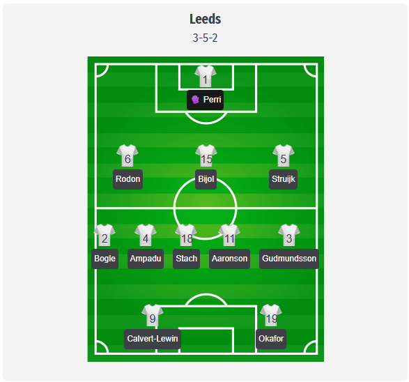 Leeds va păstra probabil formația cu cinci fundași a lui Daniel Farke, astfel încât echipa noastră prevăzută va rămâne la 3-5-2, care a declanșat recentul lor serial de meciuri fără înfrângere în campionat. Perri va apăra poarta în spatele unui trio format din Rodon, Bijol și Struijk, Bogle și Gudmundsson vor juca ca fundași laterali, Ampadu și Stach vor asigura mijlocul terenului, cu Aaronson mai în față, iar Calvert-Lewin și Okafor vor forma un duo de atac vertical și activ.