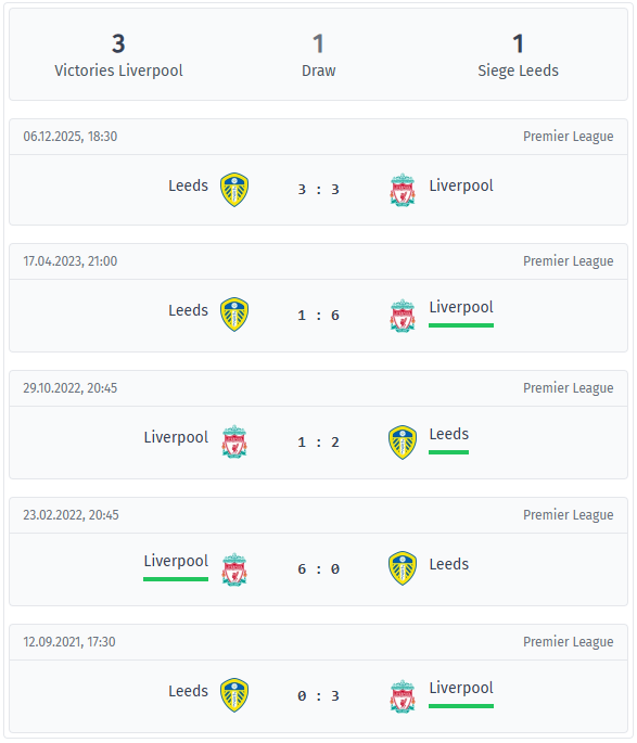 În 2021, Liverpool a început această serie cu o victorie cu 3-0 în deplasare la Leeds, urmată în 2022 de un 6-0 la Anfield, înainte de a suferi o înfrângere cu 2-1 acasă în același an. În 2023, Liverpool a răspuns cu o victorie cu 6-1 în deplasare, iar scorul de 3-3 din decembrie 2025 arată că Leeds a recuperat recent în ceea ce privește puterea ofensivă.