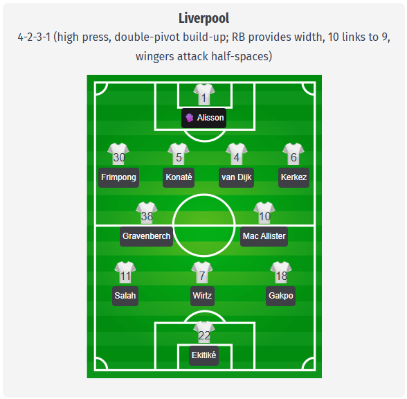 Slot ar trebui să mizeze pe familiarul 4-2-3-1, cu Alisson în spatele unei linii de patru fundași, formată cel mai probabil din Frimpong, Konaté, van Dijk și Kerkez. În construcție, multe lucruri ar trebui să treacă prin dubla de mijloc formată din Gravenberch și Mac Allister, astfel încât Wirtz să poată trage sforile ca mijlocaș central în spatele lui Ekitike. Salah și Gakpo sunt considerați titulari probabili pe aripi, ambii preferând să se retragă în spațiile libere pentru a susține pressingul și contrapressingul. Având în vedere că Bradley și Leoni sunt indisponibili, iar Bajcetic nu este disponibil, adâncimea defensivei lui Liverpool este pusă la grea încercare. Fractura de peroneu a lui Isak sugerează că Ekitike va începe din nou în atac.
