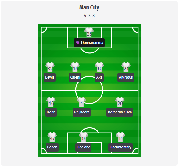 Guardiola ar trebui să rămână la 4-3-3 la City, cu Donnarumma în spatele unei linii de patru formate din Lewis, Guéhi, Aké și Aït-Nouri. Cu mingea, Lewis ar putea intra în mijlocul terenului pentru a-l ajuta pe Rodri să dicteze ritmul, în timp ce Reijnders și Bernardo Silva asigură echilibrul în jurul lui cu alergări și control. În atac, Haaland ar trebui să rămână punctul fix, Foden și Doku asigurând unghiurile și alergările potrivite. Cea mai mare problemă este în defensivă, Dias și Stones fiind în continuare absenți, iar Gvardiol fiind indisponibil pe termen lung, astfel încât duo-ul Guéhi și Aké pare cea mai logică opțiune pe hârtie. Kovacic este, de asemenea, indisponibil, ceea ce îl propulsează aproape automat pe Reijnders în echipă, ca pasator suplimentar alături de Rodri. Absența lui Savinho ar putea face din Doku primul extremă, Semenyo sau Marmoush fiind posibile alternative, în cazul în care Guardiola va face ajustări.