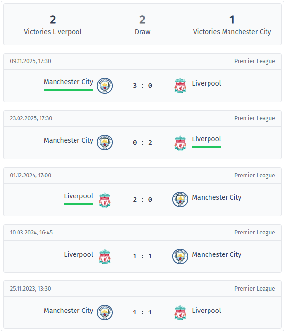 În ultimele cinci dueluri din ligă, a fost mai mult vorba de control decât de haos. Victoria cu 3-0 a lui City a venit în noiembrie 2025, dar Liverpool a răspuns anterior cu 2-0 în deplasare în 2025, iar pe Anfield Road a învins City cu 2-0 în 2024. Celelalte două întâlniri din 2024 și 2023 s-au încheiat cu 1-1. În această serie, de fiecare dată s-au marcat sub 3,5 goluri, iar în patru din cele cinci meciuri sub 2,5. Este remarcabil modelul reprize cu reprize, deoarece niciunul dintre aceste cinci meciuri nu a intrat la pauză la egalitate, deci cineva a dat de obicei prima lovitură. Interesant este că reprizele a doua au fost adesea foarte controlate, cu o serie de cinci meciuri cu sub 1,5 goluri după pauză, chiar dacă rezultatul final părea clar. Liverpool a câștigat, de asemenea, trei meciuri consecutive în repriza a doua în această comparație directă, ceea ce denotă o bună gestionare a jocului și schimbări care schimbă puțin lucrurile în ultima parte a meciului.