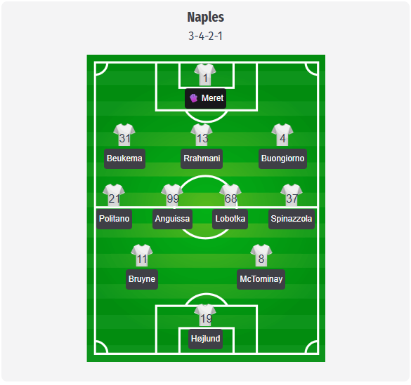 Totul indică faptul că Napoli va rămâne la obișnuitul 3-4-2-1 al lui Conte. Alex Meret – 1 ar trebui să înceapă în spatele lui Sam Beukema – 31, Amir Rrahmani – 13 și Alessandro Buongiorno – 4, Amir Rrahmani – 13 fiind probabil titular de la început, după recentele sale probleme fizice. Stanislav Lobotka – 68 și Frank Anguissa – 99 ar conferi sistemului echilibrul obișnuit. Mai în față, linia ofensivă prevăzută îi include pe Kevin De Bruyne – 11 și Scott McTominay – 8 ca sprijin pentru Rasmus Højlund – 19, ceea ce pare logic având în vedere că Romelu Lukaku este în continuare absent. Matteo Politano – 21 și Leonardo Spinazzola – 37 sunt probabil jucătorii de pe flancuri, întrucât Giovanni Di Lorenzo și David Neres nu sunt disponibili. Cu toate acestea, surse recente raportează că Conte ia în considerare schimbări și mai ample, inclusiv pe Alisson Santos, astfel încât această formație nu este încă definitivă.