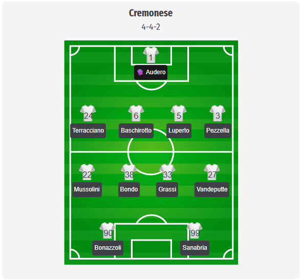 Cremonese ar trebui să rămână și aici la obișnuitul 4-4-2, iar formația probabilă sugerează o structură compactă și prudentă, după 0-0 cu Torino. Emil Audero – 1 este așteptat în poartă, în spatele lui o linie de patru formată din Filippo Terracciano – 24, Federico Baschirotto – 6, Sebastiano Luperto – 5 și Giuseppe Pezzella – 3, Baschirotto jucând un rol cheie mai ales în dueluri și la fazele fixe. La mijloc și în atac, prognoza indică prezența lui Romano Floriani Mussolini – 22 și Jari Vandeputte – 27 pe flancuri, în timp ce Warren Bondo – 38 și Alberto Grassi – 33 ar trebui să fie titulari în centru, având în vedere absențele lui Morten Thorsby și Michele Collocolo. În vârful atacului, duo-ul Federico Bonazzoli – 90 și Antonio Sanabria – 99 pare cel mai plauzibil, mai ales că Faris Moumbagna și Jamie Vardy sunt în continuare absenți.