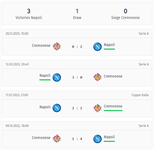 Bilanțul recent înclină clar în favoarea lui Napoli. Au câștigat meciul tur din campionat în decembrie 2025 cu 2-0, au învins Cremonese cu 3-0 în 2023 și cu 4-1 în 2022. Singura notă negativă din ultimele patru întâlniri a venit în meciul din Coppa Italia din 2023, când Napoli a terminat la egalitate, 2-2, după prelungiri, fiind eliminată ulterior la loviturile de departajare. Este de remarcat cât de repede a preluat Napoli controlul. În toate cele patru meciuri, echipa a condus la pauză și a marcat înainte de pauză, în timp ce fiecare întâlnire a produs cel puțin două goluri, iar trei dintre cele patru meciuri au depășit pragul de 2,5 goluri. Din punct de vedere istoric, faza inițială a fost cel mai fiabil indicator în această pereche.