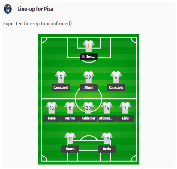 În linia de trei fundași, Raúl Albiol ar putea juca de la început între Canestrelli și Caracciolo, după revenirea sa. La mijlocul terenului, Marin și Aebischer sunt prevăzuți ca mijlocași centrali, în timp ce Akinsanmiro ar trebui să se bazeze pe valorile sale recente în dueluri. Pe flancuri, Touré și Léris vor asigura probabil lățimea terenului.