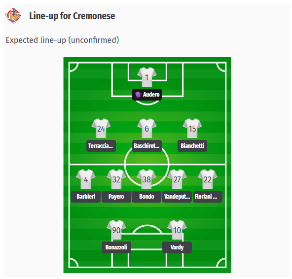 În atac, Cremonese se poate baza pe Jamie Vardy, care a marcat deja de două ori în trei meciuri și își pune în valoare experiența din Premier League. Parteneriatul cu Federico Bonazzoli funcționează din ce în ce mai bine, chiar dacă echipa duce lipsă de alternative importante, având în vedere absențele lui Faris Moumbagna, Alessio Zerbin, Alberto Grassi, Michele Collocolo și Pezzella.
