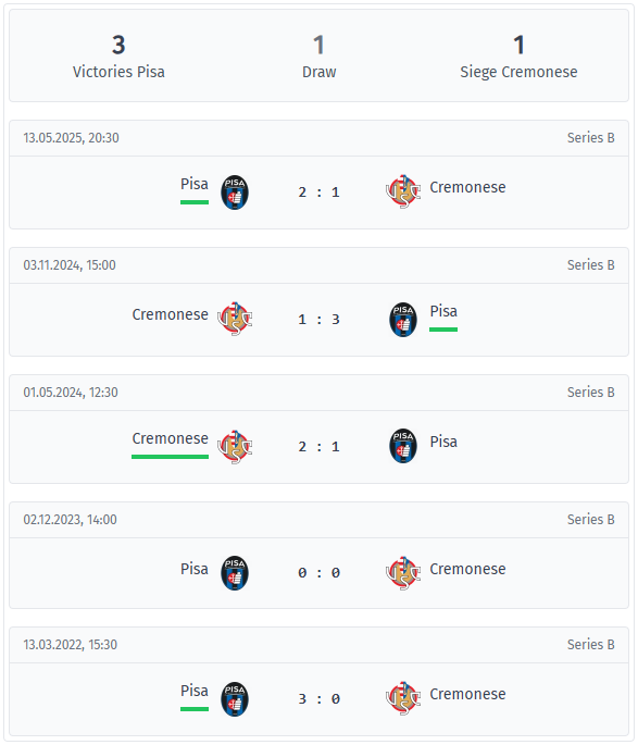 Pisa domină clar bilanțul direct: în ultimele cinci întâlniri, Pisa a câștigat de trei ori, Cremonese o dată, iar un meci s-a terminat la egalitate. Ultimele dueluri s-au încheiat în mai 2025 cu 2-1 pentru Pisa și în noiembrie 2024 cu 3-1, tot pentru Pisa.