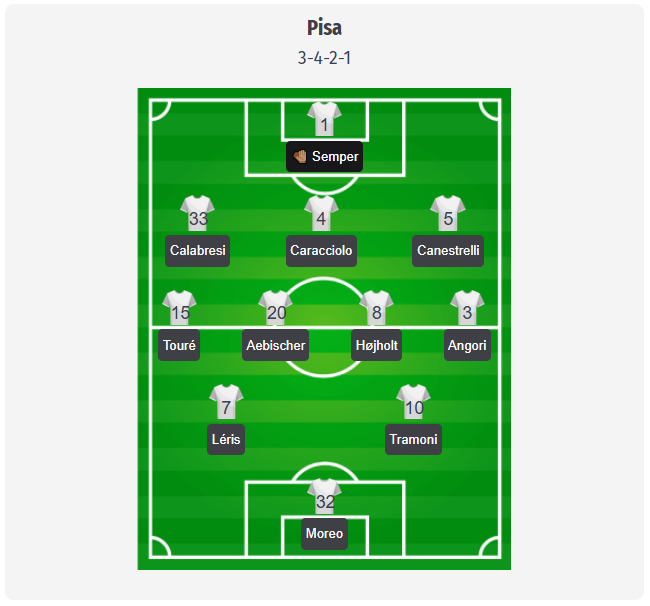 Pisa ar trebui să mizeze din nou pe obișnuitul 3-4-2-1, chiar dacă este mai degrabă o previziune decât o formație confirmată. Adrian Semper – 1 ar trebui să stea între buturi, în fața lui Arturo Calabresi – 33, Antonio Caracciolo – 4 și Simone Canestrelli – 5. Idrissa Touré – 15 și Samuele Angori – 3 vor acoperi flancurile într-o echipă compactă și rapidă în tranziție. După ce Daniel Denoon a fost eliminat din cauza problemelor la gleznă, Pisa ar trebui să păstreze pur și simplu linia de trei fundași care și-a dovedit eficiența, în loc să-și reorganizeze defensiva. La mijlocul terenului, Michel Aebischer – 20 și Malthe Højholt – 8 sunt cel mai probabil duo de mijlocași defensivi. Mehdi Léris – 7 și Matteo Tramoni – 10 ar trebui să acționeze strâns lângă Stefano Moreo – 32, în cazul în care Pisa mizează din nou pe contraatac.