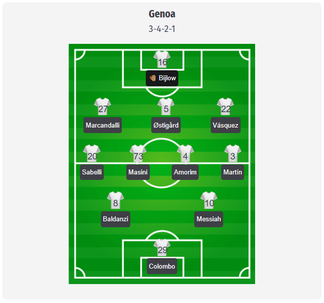 Este de așteptat ca Genoa să alinieze o formație 3-4-2-1, deși aceasta este doar o prognoză. Justin Bijlow – 16 ar trebui să stea în poartă în spatele lui Alessandro Marcandalli – 27, Leo Østigård – 5 și Johan Vásquez – 22, o linie de trei care ar trebui să controleze jocul în cazul în care Pisa cedează mingea și așteaptă ocazii de contraatac. În această variantă probabilă, Stefano Sabelli – 20 și Aarón Martín – 3 ar oferi lățime, în timp ce Patrizio Masini – 73 și Amorim – 4 ar forma cel mai probabil duo central. Tommaso Baldanzi – 8 și Junior Messias – 10 ar putea juca apoi în spațiul dintre linii, în spatele lui Lorenzo Colombo – 29. Disponibilitatea jucătorilor joacă un rol important în această prognoză: Brooke Norton-Cuffy, Jean Onana și Maxwel Cornet sunt indisponibili, motiv pentru care opțiunile pe flancuri și în mijlocul terenului sunt mai limitate. Morten Frendrup, Ruslan Malinovskyi și Mikael Egill Ellertsson sunt, de asemenea, suspendați pentru acest meci din Serie A, ceea ce explică de ce această formație este mai degrabă pragmatică decât îndrăzneață.