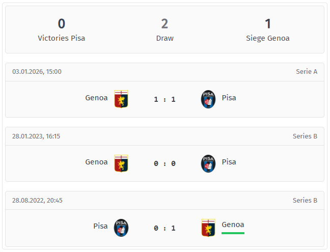 în ianuarie 2026 s-a terminat 1-1, apoi a urmat un 0-0 fără goluri în 2023, iar duelul din 2022 de la Pisa s-a încheiat cu 0-1. Pisa așteaptă, așadar, în continuare prima victorie în această confruntare, în timp ce Genoa a rămas neînvinsă în ultimele trei meciuri. Tendința golurilor este și mai evidentă: toate cele trei meciuri au avut sub 2,5 goluri, iar în fiecare repriză a doua s-au marcat mai puțin de două goluri. Asta nu înseamnă automat că și de data aceasta se va întâmpla la fel, mai ales că Pisa este sub presiune și are nevoie de puncte. Dar se potrivește cu impresia generală că această confruntare rareori oferă faze lungi de joc deschis.