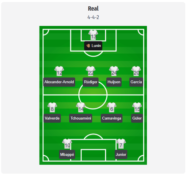 Real Madrid ar trebui să înceapă într-un 4-4-2, deși aceasta este doar o previziune și nu o echipă de start confirmată. Andriy Lunin – 13 îl va înlocui probabil pe Thibaut Courtois, accidentat, iar în spatele lui vor juca Trent Alexander-Arnold – 12, Antonio Rüdiger – 22, Dean Huijsen – 24 și Fran García – 20. Absența prelungită a lui Éder Militão, David Alaba și Ferland Mendy continuă să limiteze semnificativ opțiunile lui Arbeloa în defensivă. La mijloc, Federico Valverde – 8 și Eduardo Camavinga – 6 ar putea acoperi zona din jurul lui Aurélien Tchouaméni – 14, în timp ce Arda Güler – 15 ar fi cel mai probabil titular în rolul de creator, în cazul în care Jude Bellingham nu ar fi încă apt de joc din start, după antrenamentul său limitat. În atac, Kylian Mbappé – 10 și Vinicius Junior – 7 ar reprezenta cea mai mare amenințare, mai ales că Rodrygo și Dani Ceballos sunt amândoi indisponibili.
