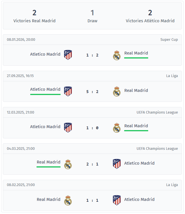 Ultimele cinci derby-uri au fost aproape echilibrate, cu câte două victorii și un egal fiecare. Totuși, tendința mai evidentă este că Atlético a marcat regulat devreme. Echipa lui Simeone a marcat în toate cele cinci întâlniri și, în ultimele patru, chiar înainte de pauză, în timp ce Real a primit goluri în toate cele cinci meciuri și, în patru partide consecutive, chiar înainte de fluierul de la pauză. Rezultatele în sine au fost totuși în ambele sensuri. Real a câștigat cea mai recentă confruntare din ianuarie 2026 cu 2-1, Atlético a răspuns în septembrie 2025 cu un 5-2 în campionat, iar duelul din Liga Campionilor din 2025 s-a decis abia după prelungiri și lovituri de departajare. Interesant este faptul că trei meciuri consecutive au avut sub 3,5 goluri, ceea ce face ca istoria recentă să fie interpretată mai degrabă ca un indiciu al tensiunii și al rezultatelor strânse decât ca o diferență clară între cele două echipe.