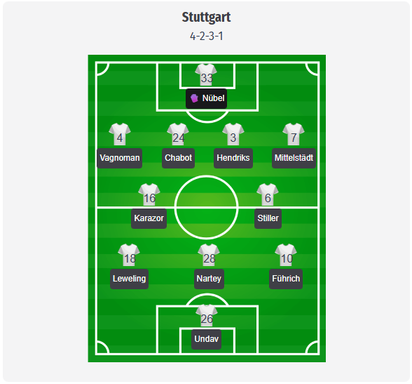 Hoeneß ar trebui să rămână la formația obișnuită 4 2 3 1 a Stuttgarts. În prognoză, Nübel este în poartă, iar în fața lui Vagnoman, Chabot, Hendriks și Mittelstädt formează linia de patru. Karazor și Stiller vor forma dubla de mijloc, cu un mix de recuperări și control al ritmului. În față, Leweling și Führich vor asigura verticalitatea, iar Nartey va fi mijlocașul central în spatele lui Undav. Aceasta este doar o echipă de start estimată, dar selecția pare clar influențată de absențe. El Khannouss este plecat cu echipa națională, Jaquez și Zagadou sunt accidentați, iar Tomás și Jovanovic sunt și ei absenți. În plus, mai mulți jucători nu sunt eligibili pentru meciurile din Europa League, printre care Demirovic, Al Dakhil, Stergiou, Stenzel, Diehl, Darvich și Drljaca. Acest lucru limitează rotația și face ca axa jucătorilor titulari să fie și mai importantă.
