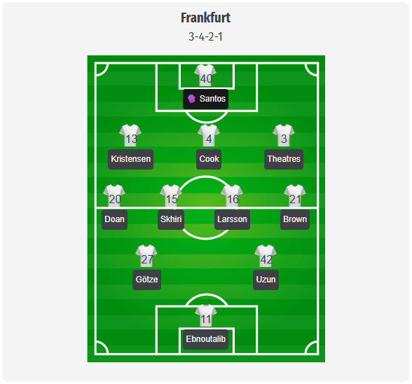 Toppmöller ar trebui să rămână la familiarul 3 4 2 1, cu Santos în spatele unei linii de trei formate din Kristensen, Koch și Theate. Doan și Brown ar trebui să ofere lățime și să inițieze primul contrapresing, în timp ce Skhiri și Larsson combină recuperările de balon cu pase rapide în față. În față, Götze și Uzun ar putea roti între linii pentru a-l alimenta pe Ebnoutalib. Marea întrebare se referă la banca de rezerve, deoarece Bahoya este bolnav, iar Burkardt și Batshuayi sunt în continuare indisponibili, astfel încât Ebnoutalib este cel mai clar punct de referință. Kalimuendo abia a sosit și ar putea servi mai degrabă ca rezervă pentru a da un impuls, decât să înceapă direct din start. Pe flancuri, absențele lui Baum și Chandler reduc opțiunile, așa că Kosugi sau Buta sunt o soluție plauzibilă în cazul în care vor fi necesare schimbări.