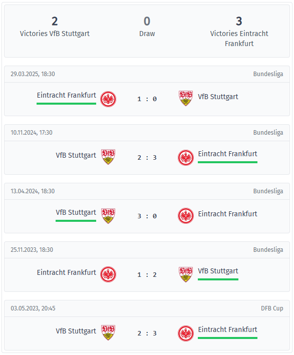 În ultimele cinci dueluri, Frankfurt a avut un ușor avantaj, cu trei victorii față de două pentru Stuttgart, fără egaluri. Cea mai recentă întâlnire, din martie 2025, s-a încheiat cu o victorie strânsă, 1-0, pentru Frankfurt, după ce în 2024 câștigase cu 3-2 în deplasare. Cea mai bună replică a lui Stuttgart a venit în 2024, cu o victorie cu 3-0 pe teren propriu, dar, per total, echipa oaspete a câștigat trei din cele cinci meciuri. Faptul că nu au existat egaluri a fost o caracteristică destul de marcantă. Când aceste două echipe se întâlnesc, de obicei se înscriu goluri. Patru dintre cele cinci meciuri au avut peste 2,5 goluri și patru au avut peste 1,5, o serie cu scoruri totale ridicate, care s-a întrerupt abia la 1-0 în martie 2025. Ambele echipe au marcat în trei dintre cele cinci meciuri, dar au existat și meciuri fără goluri, cum arată victoria cu 3-0 a Stuttgarterului în 2024 și recentul shutout al Frankfurtului. Patru dintre cele cinci întâlniri s-au decis cu o diferență de un gol. Interesant este că, între 2023 și 2024, Stuttgart a avut o serie de trei meciuri împotriva Frankfurtului în care a câștigat prima repriză, iar în exact aceste trei meciuri a marcat înainte de pauză. Cu toate acestea, Frankfurt a găsit modalități de a profita de momentele importante, printre care victoria cu 3-2 în semifinala Cupei DFB din 2023. În perspectiva următorului capitol, Stuttgart nu îi va avea la dispoziție pe Zagadou și Jaquez, iar Frankfurt va trebui să se descurce fără Burkardt și Batshuayi.