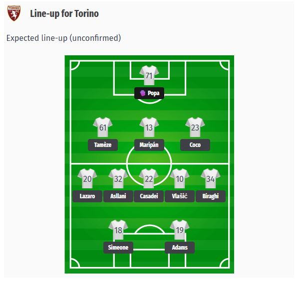 Torino ar trebui să joace în sistemul 3-5-2, cu câteva modificări din cauza accidentărilor. În defensivă, Biraghi ar putea să-l înlocuiască pe Nkounkou, accidentat, în timp ce Vlašić ar putea reveni în primul unsprezece. Duo-ul de atac Simeone și Adams s-a dovedit eficient împotriva lui Napoli și ar trebui să înceapă din nou împreună.
