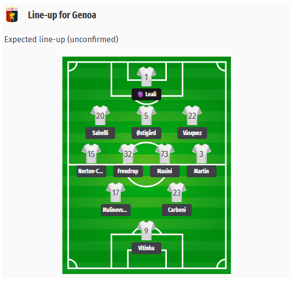 Patrick Vieira ar trebui să alinieze sistemul obișnuit 3-4-2-1, cu Sabelli, Østigård și Vásquez în linia de trei fundași, în timp ce Norton-Cuffy și Martín vor ocupa pozițiile laterale. Stanciu lipsește din cauza unei accidentări la coapsă, iar Marcandalli este indisponibil din cauza unor probleme musculare, motiv pentru care Frendrup și Masini ar putea fi preferați în mijlocul terenului. În atac, Vitinha ar putea juca ca vârf, în spatele lui Malinovskyi și Carboni ca forțe creative, Vieira subliniind că echipa trebuie să lucreze la eficiență, în ciuda ocaziilor create.