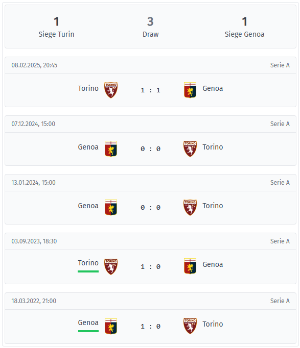 Bilanțul direct al ultimelor cinci dueluri dintre Turin și Genova este extrem de defensiv: câte o victorie pentru Turin și Genova și trei egaluri, niciunul dintre aceste meciuri nefiind încheiat cu mai mult de două goluri. Este de remarcat faptul că în toate cele cinci meciuri nu s-a marcat niciun gol în repriza a doua, toate golurile fiind marcate înainte de pauză. Rezultatele recente subliniază această tendință: februarie 2025 s-a încheiat cu 1-1, decembrie 2024 fără goluri, iar în total patru din cele cinci meciuri s-au încheiat cu maximum un gol. Torino a câștigat ultima dată în septembrie 2023 cu 1-0, iar ultima victorie a Genovei datează din martie 2022. Această istorie sugerează un meci în care disciplina tactică și organizarea defensivă vor avea clar prioritate față de riscul ofensiv.