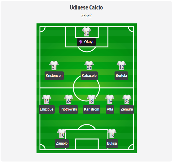 Runjaić ar trebui să rămână la formația obișnuită 3-5-2 a lui Udinese, cu Okoye în poartă și o linie de trei formată din Kristensen, Kabasele și Bertola. Ehizibue și Zemura vor asigura lățimea ca aripi, în timp ce Piotrowski și Karlström vor dicta ritmul în centru, împreună cu Atta. În atac, se preconizează că Zaniolo va juca în spatele lui Buksa și va miza pe combinații rapide și directe. Problema lui Solet la aductori îl face pe Bertola să fie probabil înlocuitorul în linia defensivă, iar absența pe termen lung a lui Zanoli menține ierarhia pe pozițiile de fundași laterali în favoarea lui Ehizibue. Cea mai mare rezervă este Davis, care continuă să lipsească, ceea ce îl lasă pe Buksa ca punct de referință clar în atac. Bayo și Gueye sunt alternativele mai evidente în timpul meciului, în cazul în care Udinese are nevoie de un alt profil în ultima clipă.