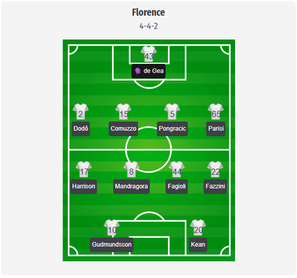 Vanoli ar trebui să rămână la formația 4-4-2, de Gea urmând să înceapă în spatele lui Dodô, Comuzzo, Pongracic și Parisi. Aceasta pare într-o oarecare măsură o soluție de urgență, deoarece Lezzerini este accidentat și Gosens nu este disponibil, astfel încât Parisi este cel mai probabil înlocuitor pe stânga. În apărare, formația ar trebui să rămână compactă, iar în atac, fundașii laterali ar trebui să asigure lățimea. La mijloc, prognoza indică Harrison și Fazzini ca jucători puternici pe benzi, alături de Mandragora și Fagioli în centru, Fagioli având probabil sarcina de a-i alimenta din timp pe cei doi din față. În atac, Gudmundsson și Kean sunt prevăzuți ca pereche, Gudmundsson urmând să coboare în spațiile libere și să lege jocul, în timp ce Kean va rămâne mai sus. Absența lui Solomon elimină opțiunile clasice de aripi, astfel încât rolurile pe flancuri ar putea fi puțin mai conservatoare.