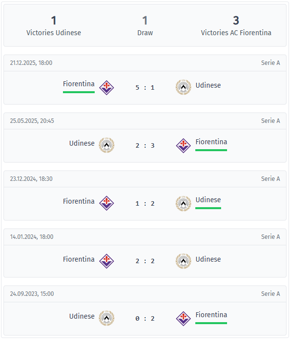 În ultimele cinci confruntări directe, AC Florența a avut avantajul cu trei victorii, printre care 5-1 în decembrie 2025 și 3-2 la Udinese în mai 2025. Cea mai bună replică a lui Udinese a fost o victorie cu 2-1 în deplasare în 2024, iar în 2024 a fost un 2-2, iar seria a început cu o victorie cu 2-0 a lui AC Florenz în 2023. Modelele sunt greu de ignorat: Udinese a primit goluri în toate cele cinci meciuri, iar fiecare meci a avut peste 1,5 goluri, patru din cinci având peste 2,5. Interesant este că primele reprize au fost adesea controlate, cu patru din cinci sub 1,5 goluri, înainte ca meciurile să se deschidă după pauză. Această tendință în favoarea reprizei a doua se potrivește cu o tendință recentă a echipei Udinese de a pierde fazele finale în acest duel, motiv pentru care conducerea ar putea decide din nou punctele în ultimele minute.