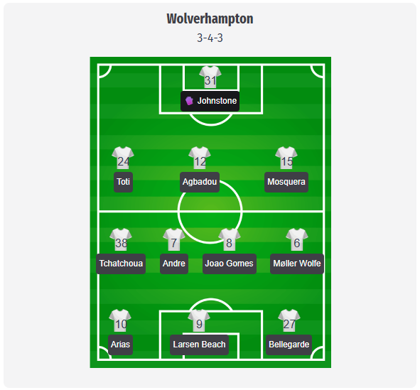 Rob Edwards va miza probabil din nou pe un sistem 3-4-3 împotriva Nottingham Forest, cu Johnstone în poartă, iar în fața lui ar putea începe o linie de trei cu Toti, Agbadou și Mosquera. Pe flancuri sunt așteptați Tchatchoua, în funcție de necesități pe stânga sau pe dreapta, și Møller Wolfe, iar în mijlocul terenului Andre și João Gomes ar trebui să închidă spațiile și să se ocupe de construirea jocului. În atac, Arias, Strand Larsen și Bellegarde sunt cei mai probabili titulari și ar trebui să asigure pericolul în fața porții, în ciuda perioadei de stagnare. În apărare lipsesc în continuare Hoever și Doherty, iar absența pe termen lung a lui Rodrigo Gomes în mijlocul ofensiv este deosebit de gravă, revenirea sa fiind așteptată abia în februarie. Având în vedere forma foarte slabă, cu doar două puncte din 13 meciuri, nu sunt de așteptat multe experimente tactice, însă formația menționată rămâne o prognoză și trebuie considerată speculativă până la anunțarea oficială a echipei.