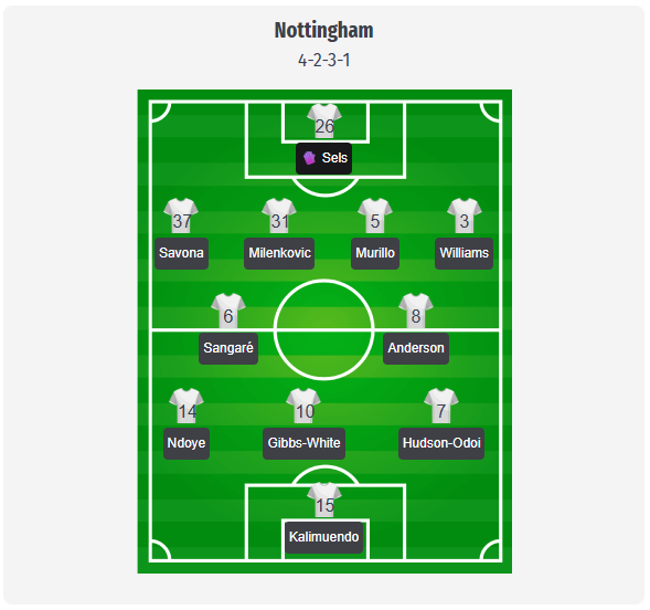 Nottingham Forest ar trebui să joace în sistemul 4-2-3-1, modelul de bază cu care antrenorul Sean Dyche a obținut recent trei victorii consecutive. Murillo și Gibbs-White sunt probabil din nou disponibili după accidentări minore, Dyche i-a menajat pe amândoi din precauție, pentru a nu risca suplimentar. În Europa League lipsesc mai mulți jucători din motive disciplinare sau legate de înregistrare, Awoniyi, Hutchinson și Gunn nu se află în lot, iar Douglas Luiz are probleme la coapsă și Zinchenko are o accidentare la inghinală. În atac, Kalimuendo ar putea fi singurul vârf, iar în spatele lui se așteaptă ca Ndoye, Gibbs-White și Hudson-Odoi să joace în linia ofensivă nominală pe cele trei poziții.