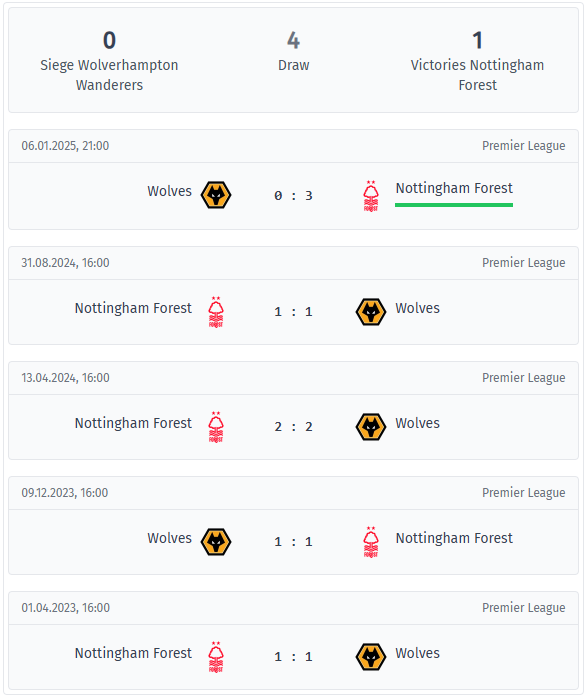 În ultimele cinci confruntări directe dintre Wolverhampton și Nottingham Forest, Forest a obținut o victorie, 3-0 în ianuarie 2025 la Molineux, și patru egaluri, printre care 1-1 în august 2024 și 2-2 în aprilie 2024. Nottingham Forest a marcat în toate cele cinci partide și a condus în prima repriză în fiecare dintre ele, iar Wolverhampton a primit cel puțin un gol înainte de pauză în fiecare dintre aceste meciuri, ceea ce indică o vulnerabilitate specială în faza inițială împotriva acestui adversar. Gazdele au reușit să înscrie și ele în patru dintre cele cinci întâlniri. În toate duelurile s-au marcat cel puțin două goluri, doar o singură dată s-au marcat mai mult de trei goluri, iar în ansamblu, comparația directă relevă un model recurent, cu meciuri bogate în goluri, dar rareori complet deschise.