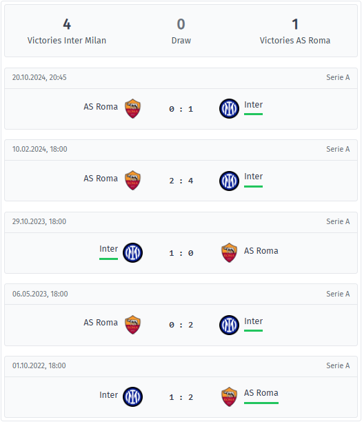 Patru victorii pentru Inter, una pentru Roma – acesta este bilanțul ultimelor cinci dueluri. Milanul a marcat de fiecare dată, iar Roma a încasat cel puțin un gol în fiecare meci. Interesant este că toate întâlnirile s-au încheiat cu sub 3,5 goluri și nu a fost niciun egal.